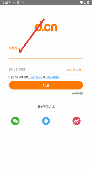 3、跳轉(zhuǎn)到手機號碼登錄頁面中,可以點擊輸入框填寫手機號,用來獲取驗證碼進行登錄操作。