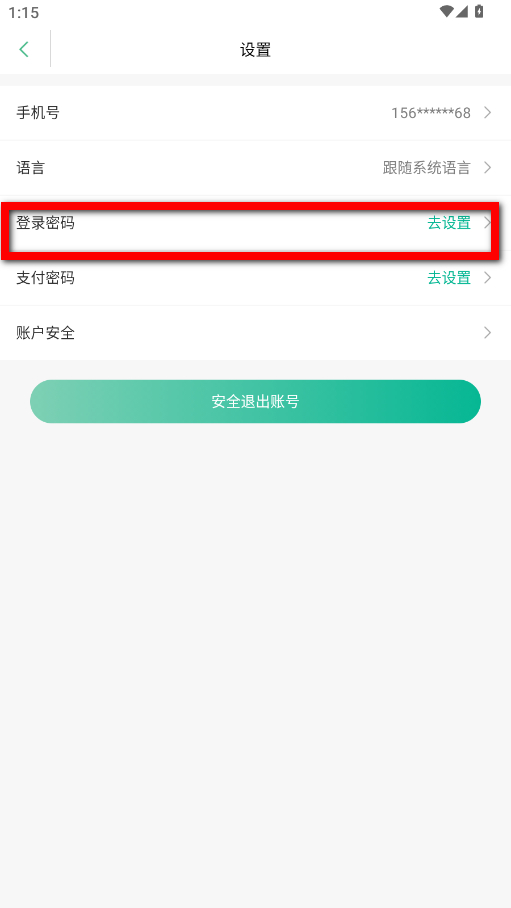3、在設(shè)置界面,點(diǎn)擊登錄密碼后的去設(shè)置選項(xiàng),進(jìn)入密碼設(shè)置頁。
