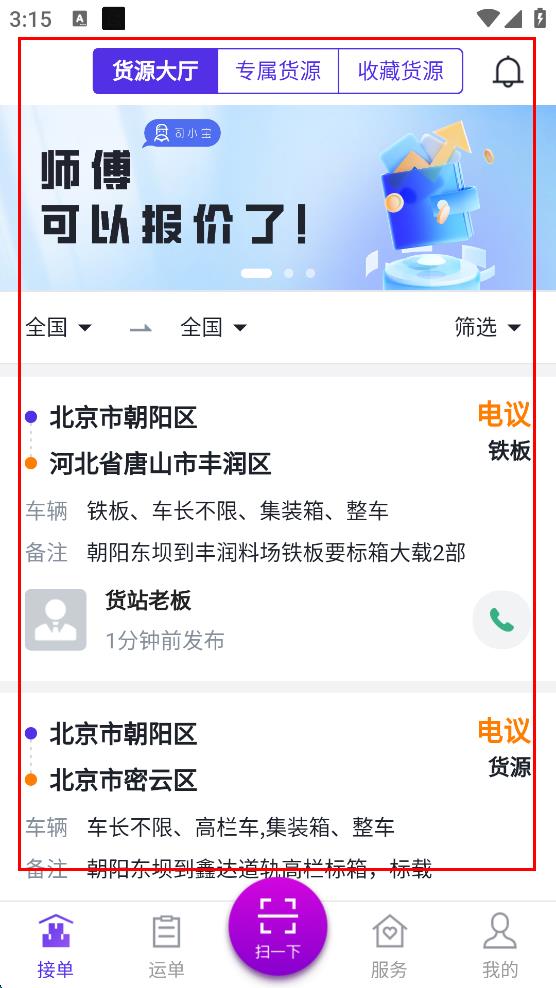 2、貨車司機自由接單,在全部貨源訂單之中可以自選接單時間、貨物訂單類型;