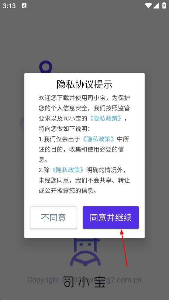 1、打開司小寶App,在隱私協(xié)議提示頁面,點擊“同意并繼續(xù)”按鈕。