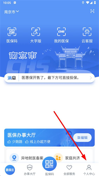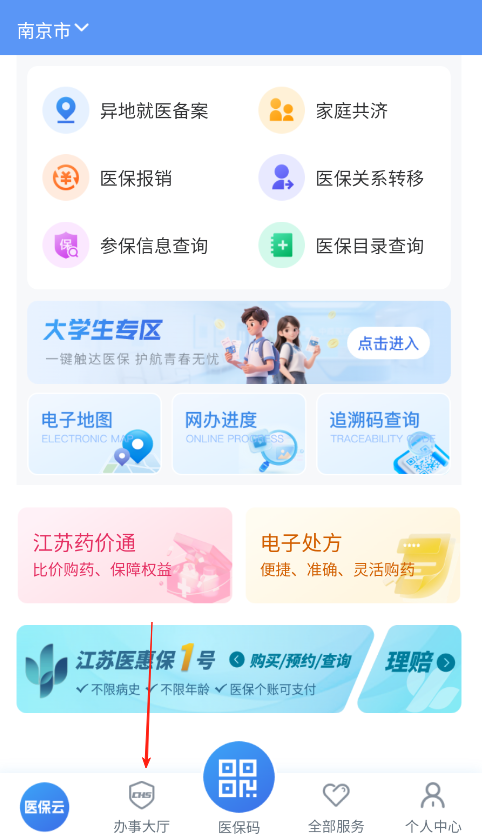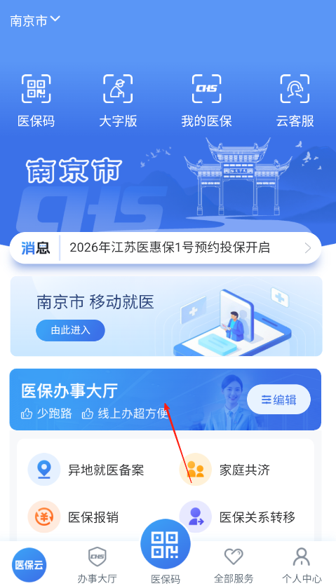 1、打開南京醫(yī)保APP,進(jìn)入首頁,可使用醫(yī)保碼大字版等功能,查看2026年江蘇醫(yī)惠保1號預(yù)約投保消息,點(diǎn)擊南京市移動就醫(yī)入口,進(jìn)入醫(yī)保辦事大廳辦理業(yè)務(wù)。