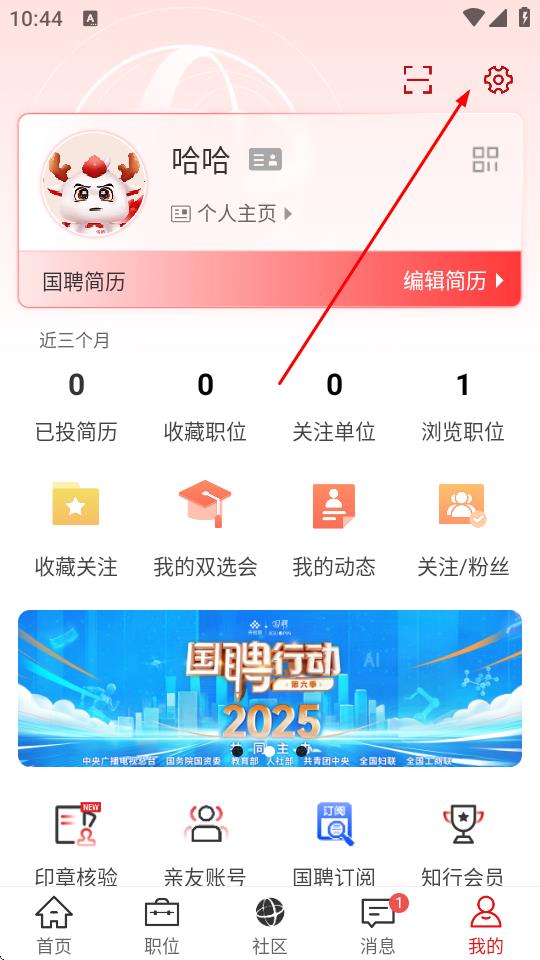 2、在我的頁(yè)面,點(diǎn)擊右上角的設(shè)置圖標(biāo)。