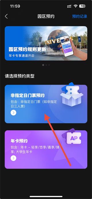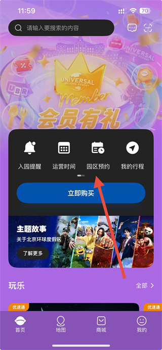 1、打開北京環(huán)球度假區(qū)APP,在首頁點(diǎn)擊園區(qū)預(yù)約選項(xiàng)。