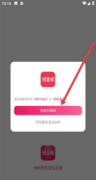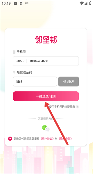 1、點(diǎn)擊同意并繼續(xù)按鈕,同意鄰里邦的《用戶協(xié)議》與《隱私條款》,進(jìn)入登錄界面。