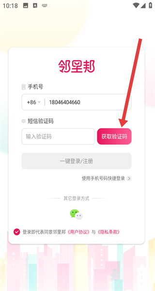 2、在登錄界面,勾選登錄即代表同意鄰里邦《用戶協(xié)議》與《隱私條款》選項(xiàng),輸入手機(jī)號(hào)碼。