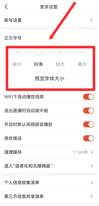3、在頁面找到正文字號的區(qū)域,通過拖動滑塊選擇字號,完成設置操作。