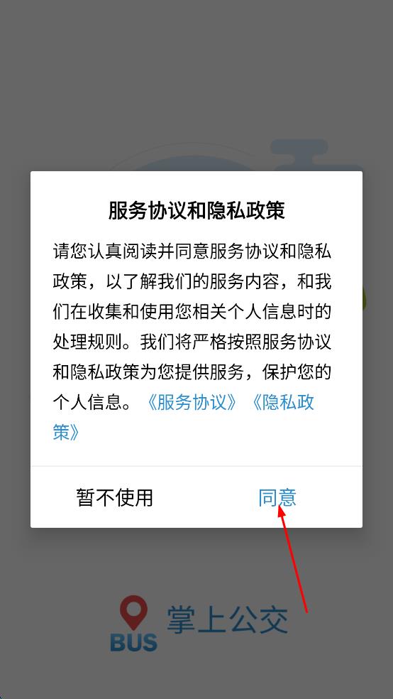 1、打開掌上公交APP,出現(xiàn)服務(wù)協(xié)議和隱私政策界面,仔細(xì)閱讀后點(diǎn)擊“同意”,進(jìn)入主界面。