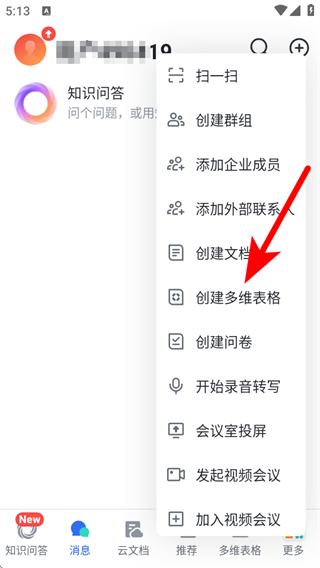 2、在功能的菜單中,點(diǎn)擊創(chuàng)建多維表格,進(jìn)入多維表格界面。