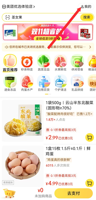 1、打開美團(tuán)優(yōu)選APP,點(diǎn)擊右上角我的,進(jìn)入個(gè)人的頁面。