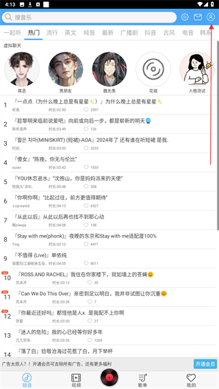 1、打開輕音社的應(yīng)用APP,進(jìn)入首頁點(diǎn)擊右上角人像的圖標(biāo)。