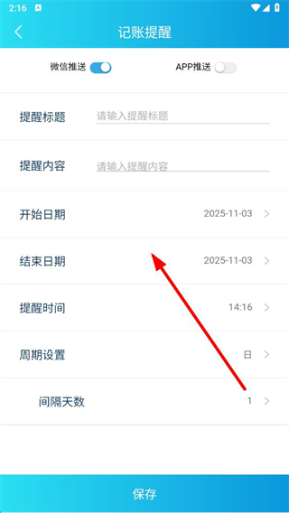 4、在頁面完成設(shè)置后,點(diǎn)擊保存即可完成記賬提醒設(shè)置。