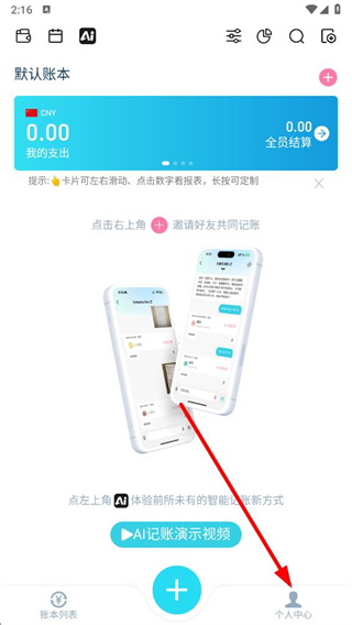 1、打開百事AA記賬APP,點(diǎn)擊右下角個(gè)人中心進(jìn)入個(gè)人頁面。