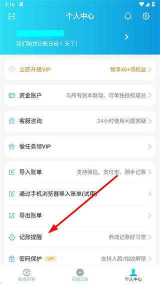 2、在個(gè)人頁面中,點(diǎn)擊記賬提醒選項(xiàng)。