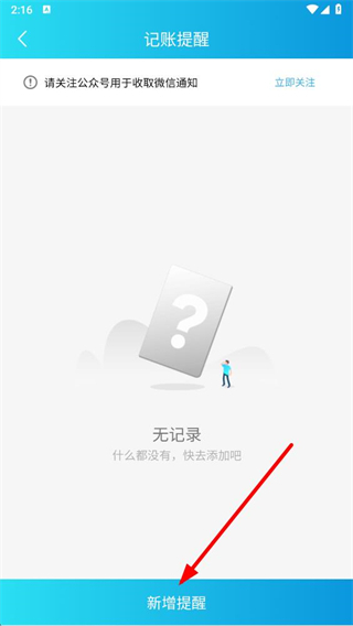 3、進(jìn)入記賬提醒頁面后,點(diǎn)擊新增提醒選項(xiàng)。