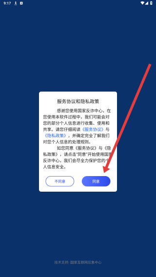 1、打開(kāi)應(yīng)用時(shí),面對(duì)服務(wù)協(xié)議和隱私政策彈窗,點(diǎn)擊同意按鈕,允許系統(tǒng)收集與使用個(gè)人信息,推進(jìn)操作流程。