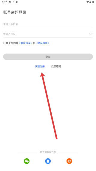 2、進(jìn)入賬號(hào)密碼登錄界面,若未注冊(cè),點(diǎn)擊快速注冊(cè)選項(xiàng),開(kāi)啟賬號(hào)注冊(cè)流程,無(wú)需先行填寫(xiě)賬號(hào)密碼。