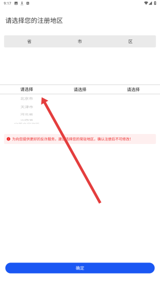 3、在注冊(cè)地區(qū)選擇頁(yè)面,依次選定省、市、區(qū),確認(rèn)所選區(qū)域后點(diǎn)擊確定,完成注冊(cè)地區(qū)設(shè)置步驟。