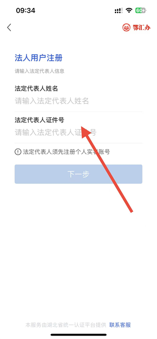 4、在法人用戶注冊頁面輸入法定代表人姓名、證件號等信息,按照提示完成后續(xù)操作即可完成法人身份注冊。