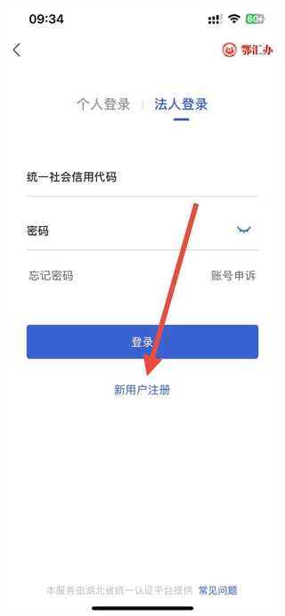 3、在法人登錄頁面點擊新用戶注冊選項,進入法人用戶注冊頁面。
