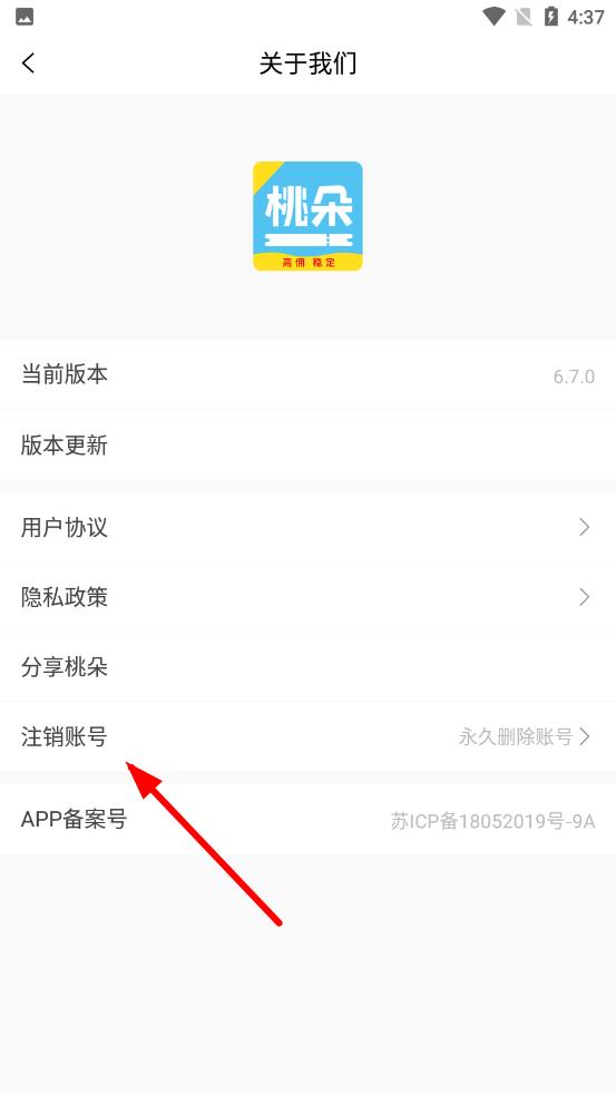 3、在關(guān)于我們頁面中繼續(xù)下滑找到注銷賬號選項,點擊該選項按照后續(xù)系統(tǒng)提示操作,即可完成桃朵app賬號的注銷。