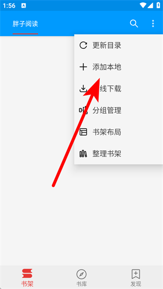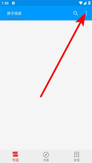 1、在胖子閱讀書架頁面,點(diǎn)擊右上角更多選項(xiàng),彈出功能菜單。
