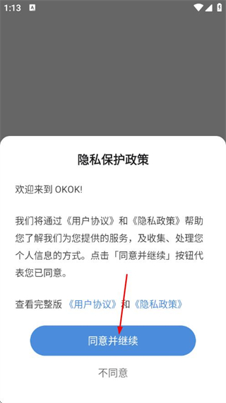 1、打開OKOK國際版APP,在隱私保護(hù)政策彈窗中點擊同意并繼續(xù)。