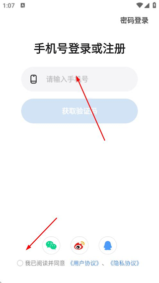 2、在手機號登錄或注冊頁面輸入手機號碼,勾選用戶協(xié)議,點擊獲取驗證碼。