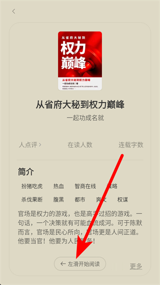 2、在小說詳情界面,點擊左滑開始閱讀,進入小說閱讀頁面。
