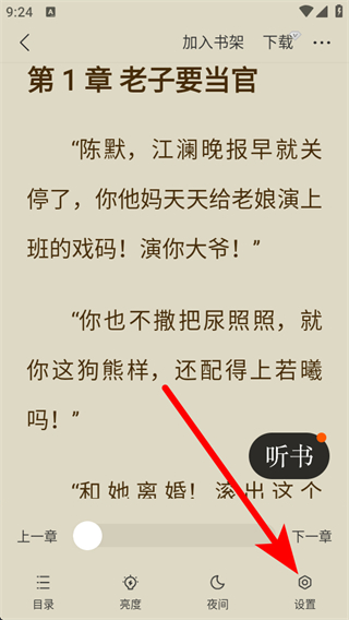2、在小說閱讀界面中,點擊右下角的設置,進入設置頁面。