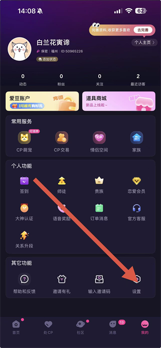 2、在個(gè)人頁(yè)面中,向下滑動(dòng)找到設(shè)置選項(xiàng)并點(diǎn)擊進(jìn)入設(shè)置界面。