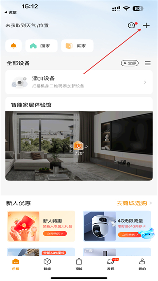 1、打開樂橙監(jiān)控APP,在首頁右上角點擊+的圖標。
