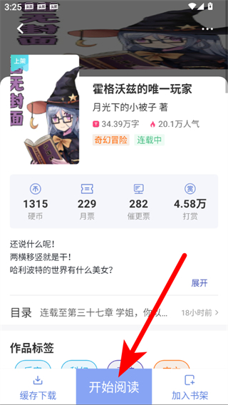 3、在小說詳情頁面,找到“開始閱讀”按鈕并點擊,進入小說閱讀界面。