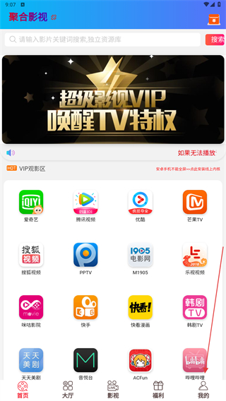 1、啟動聚合影視的應(yīng)用,進(jìn)入首頁點(diǎn)擊右下角我的圖標(biāo)。