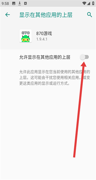 4、懸浮球權限設置頁面開啟“允許顯示在其他應用的上層”開關,完成懸浮球權限設置。