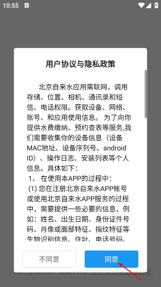 1、打開北京自來水APP,出現(xiàn)用戶協(xié)議與隱私政策頁面,仔細(xì)查看后點(diǎn)擊“同意”按鈕。