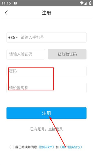 3、設置密碼并填寫昵稱,點擊注冊按鈕,即可完成賬號注冊操作。
