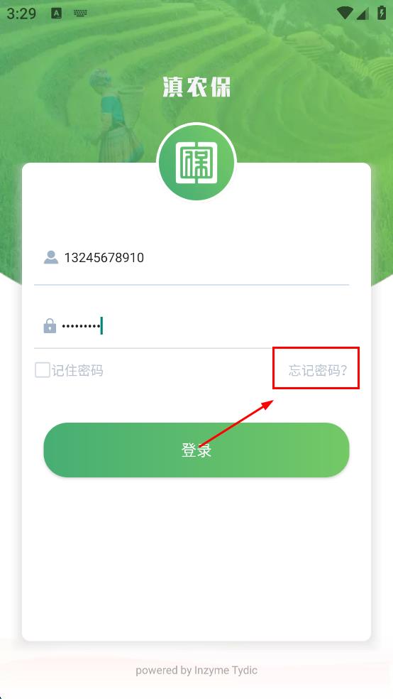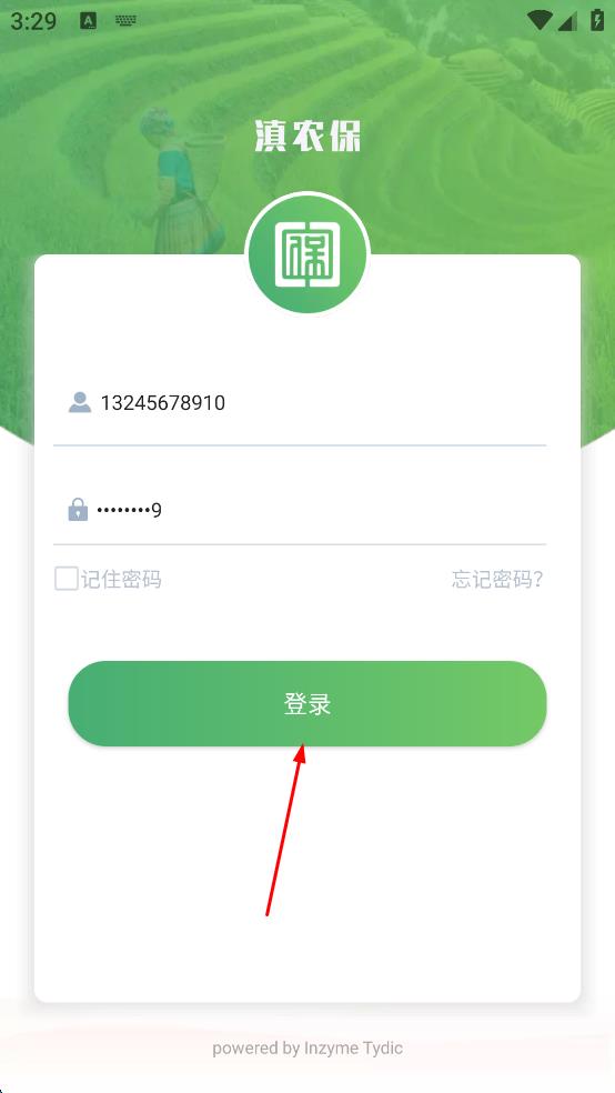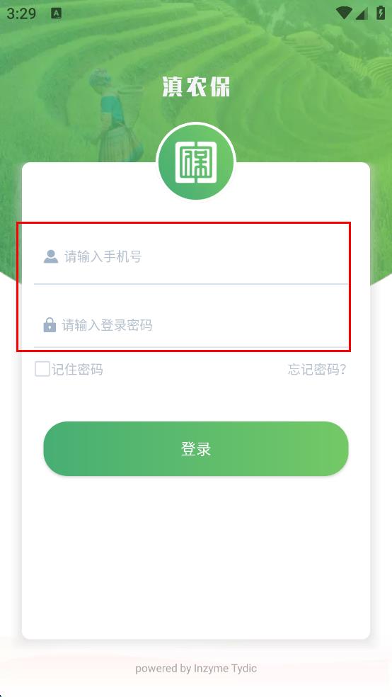 1、打開滇農(nóng)保APP,進(jìn)入登錄頁面,輸入手機(jī)號和登錄密碼。