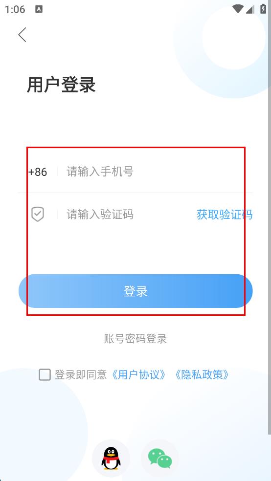 4、在用戶登錄界面,輸入手機號,點擊“獲取驗證碼”并輸入驗證碼,最后點擊“登錄”按鈕。
