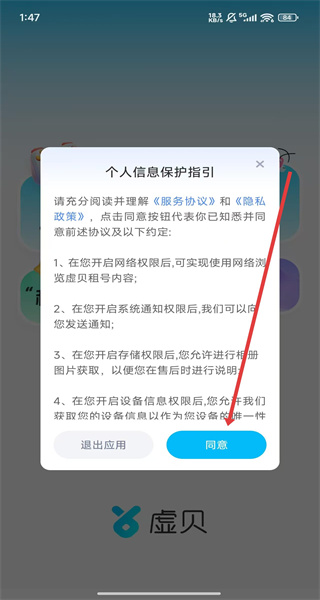 1、在虛貝APP的“個人信息保護(hù)指引”彈窗點(diǎn)擊“同意”,進(jìn)入主界面。