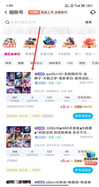 3、在租賬號頁面點(diǎn)擊第一個賬號商品,進(jìn)入商品詳情頁面。