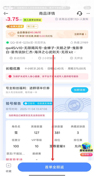 4、在商品詳情頁面可查看該賬號的價格、長租優(yōu)惠、驗(yàn)號報告等信息,點(diǎn)擊“首單全額返”可進(jìn)行租號操作。