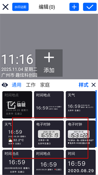 3、在水印設(shè)置頁面選擇喜歡的水印樣式,如電子時鐘類樣式。