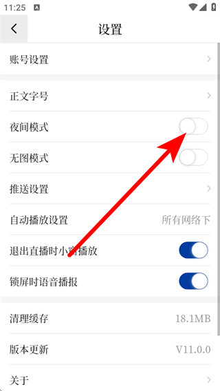 3、在設(shè)置頁面,找到夜間模式選項,點擊開關(guān)開啟夜間模式。