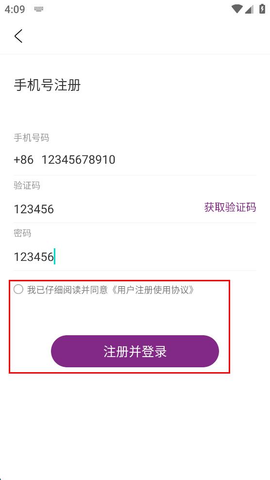 4、勾選我已仔細(xì)閱讀并同意用戶注冊使用協(xié)議,然后點(diǎn)擊下方的“注冊并登錄”按鈕,即可完成注冊登錄操作。