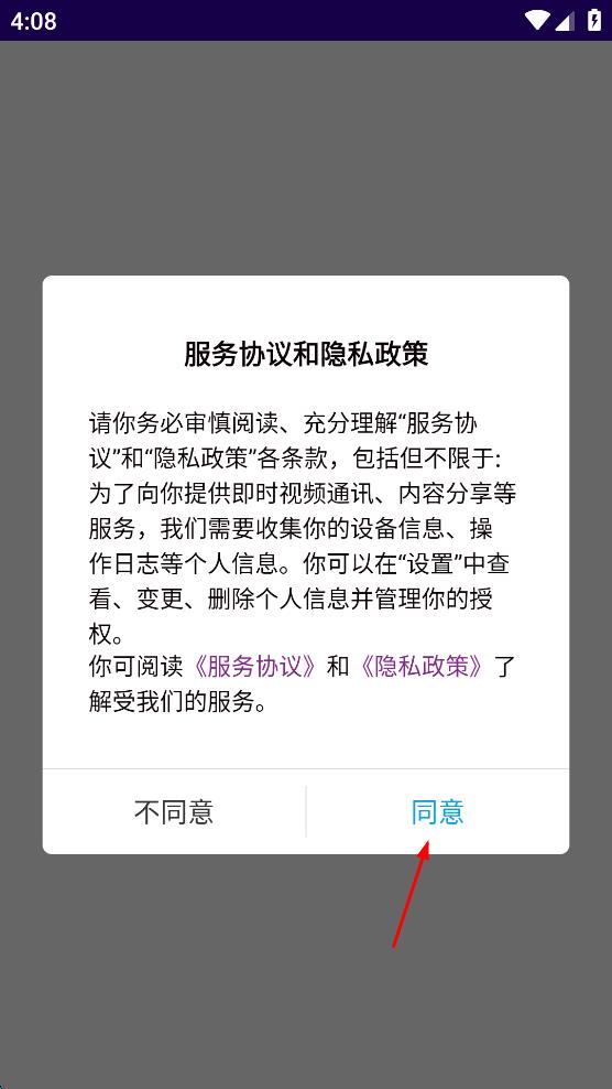 1、打開公豐同緣APP,在彈出的“服務(wù)協(xié)議和隱私政策”提示框中,點(diǎn)擊“同意”按鈕,進(jìn)入登錄頁面。