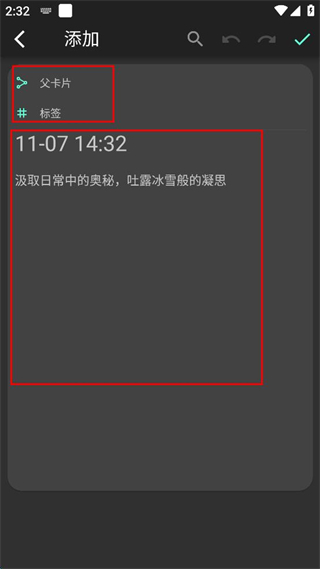 2、在添加界面,可設(shè)置父卡片、標(biāo)簽,輸入筆記內(nèi)容。