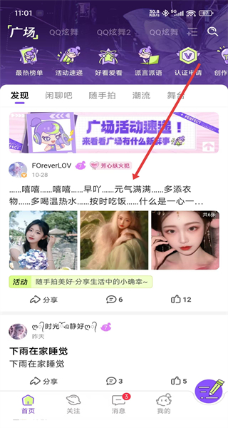 4、授權(quán)完成后,進(jìn)入掌上炫舞的廣場頁面,即可點擊文章進(jìn)行瀏覽。