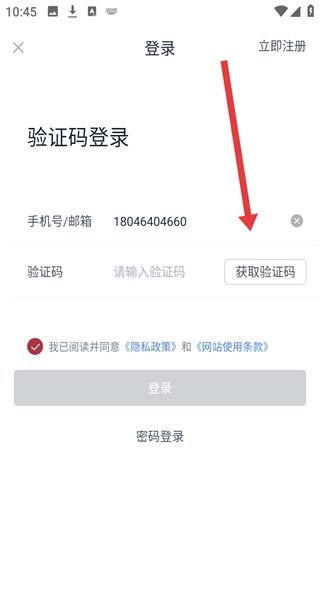 4、在登錄頁面輸入手機(jī)號后,點擊“獲取驗證碼”,輸入收到的驗證碼后完成賬號登錄操作。