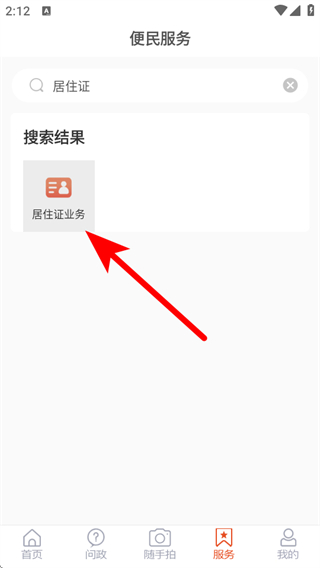 3、在搜索的結(jié)果中,需要點(diǎn)擊居住證業(yè)務(wù),進(jìn)入業(yè)務(wù)辦理入口。