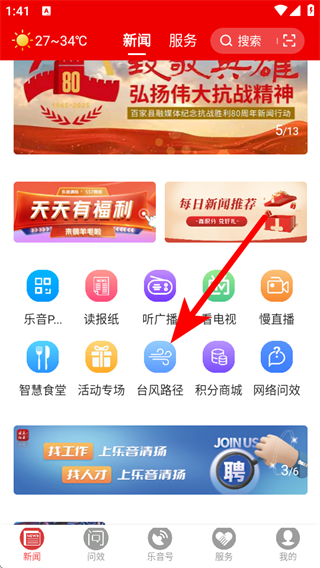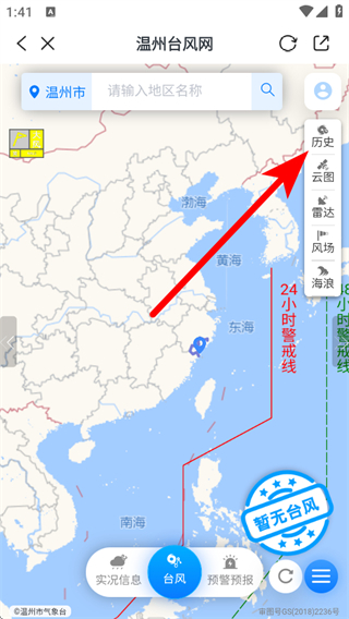 1、打開app在首頁找到并點擊臺風路徑選項,進入溫州臺風網(wǎng)頁面。